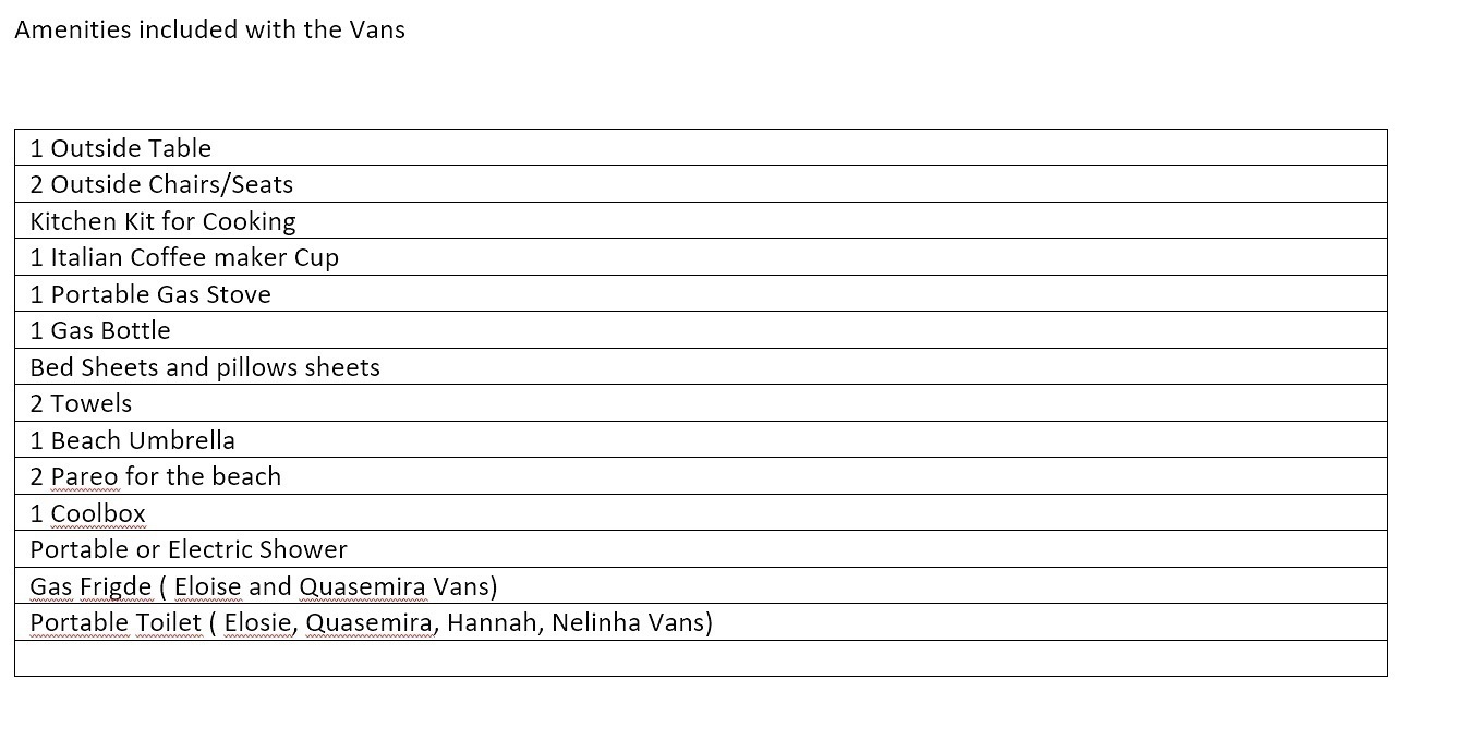Also a portable shower, a big table, 2 comfortable chairs, an umbrella for the sun, portable camping fridge, Gas Stove and all the kitchen equipment including an italian coffe maker.