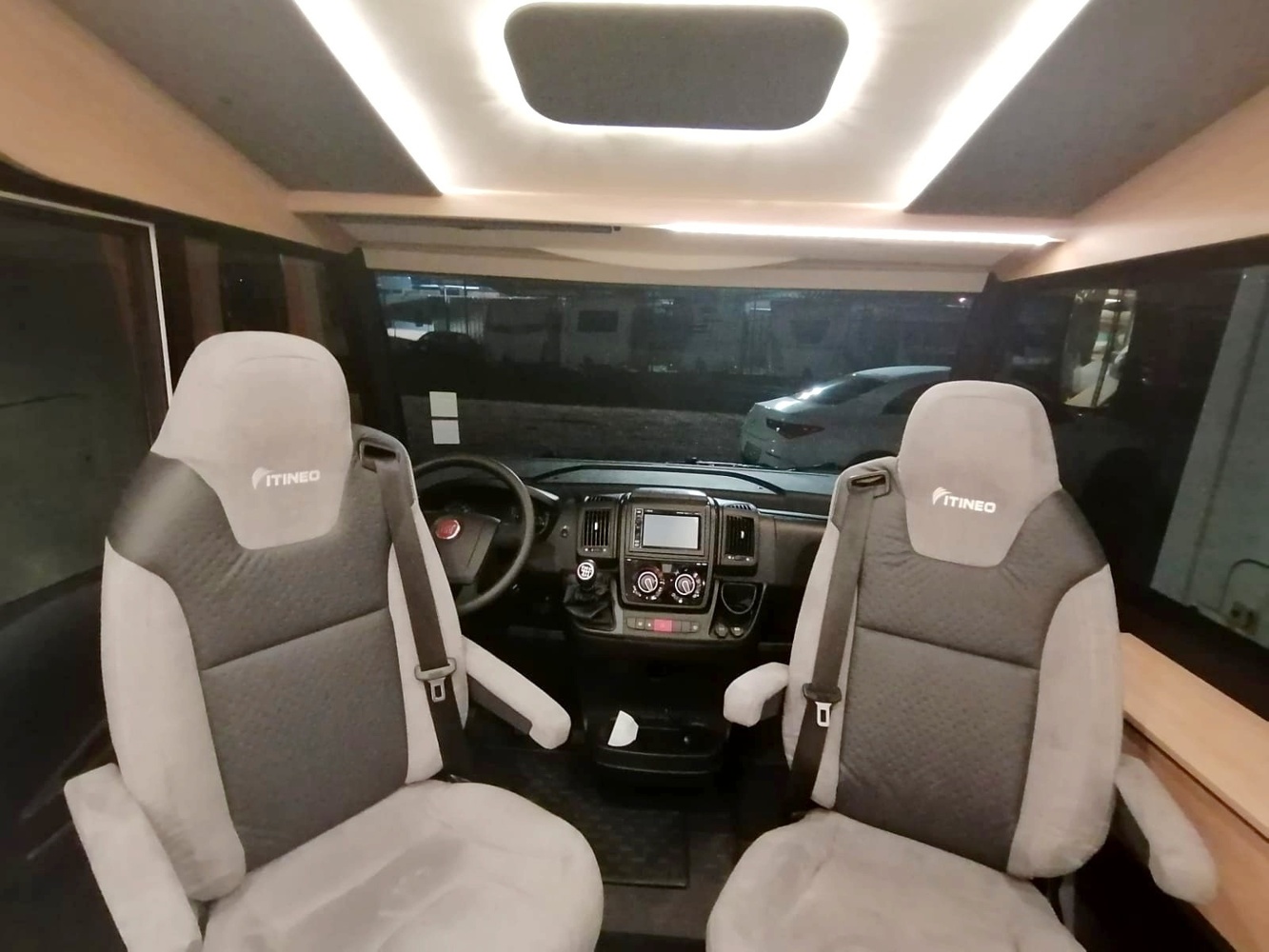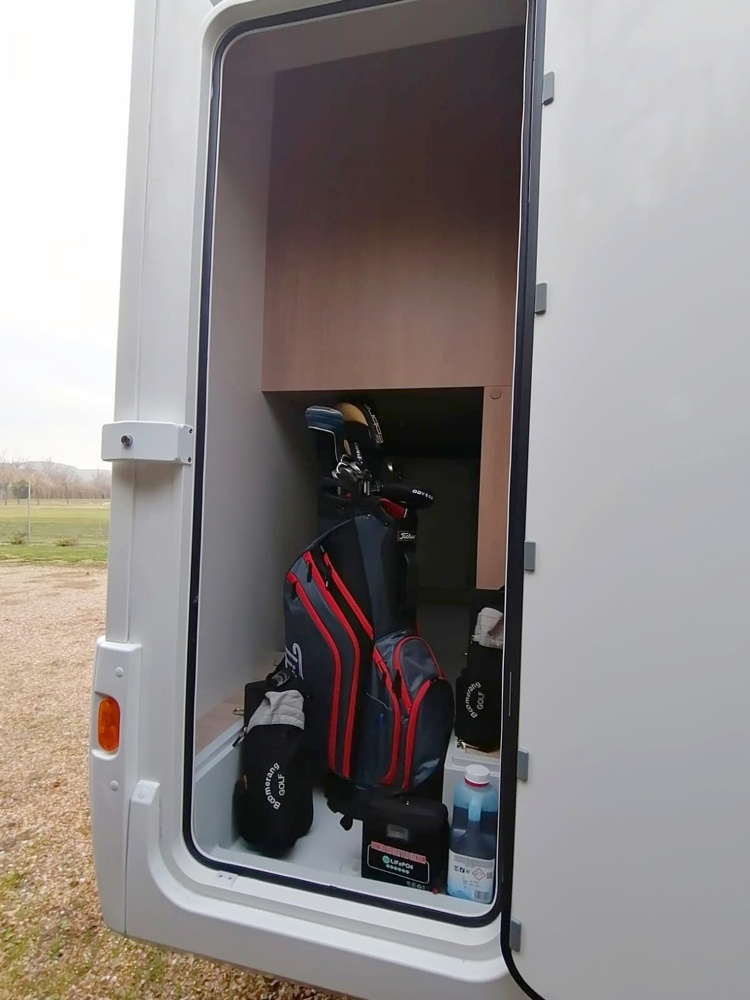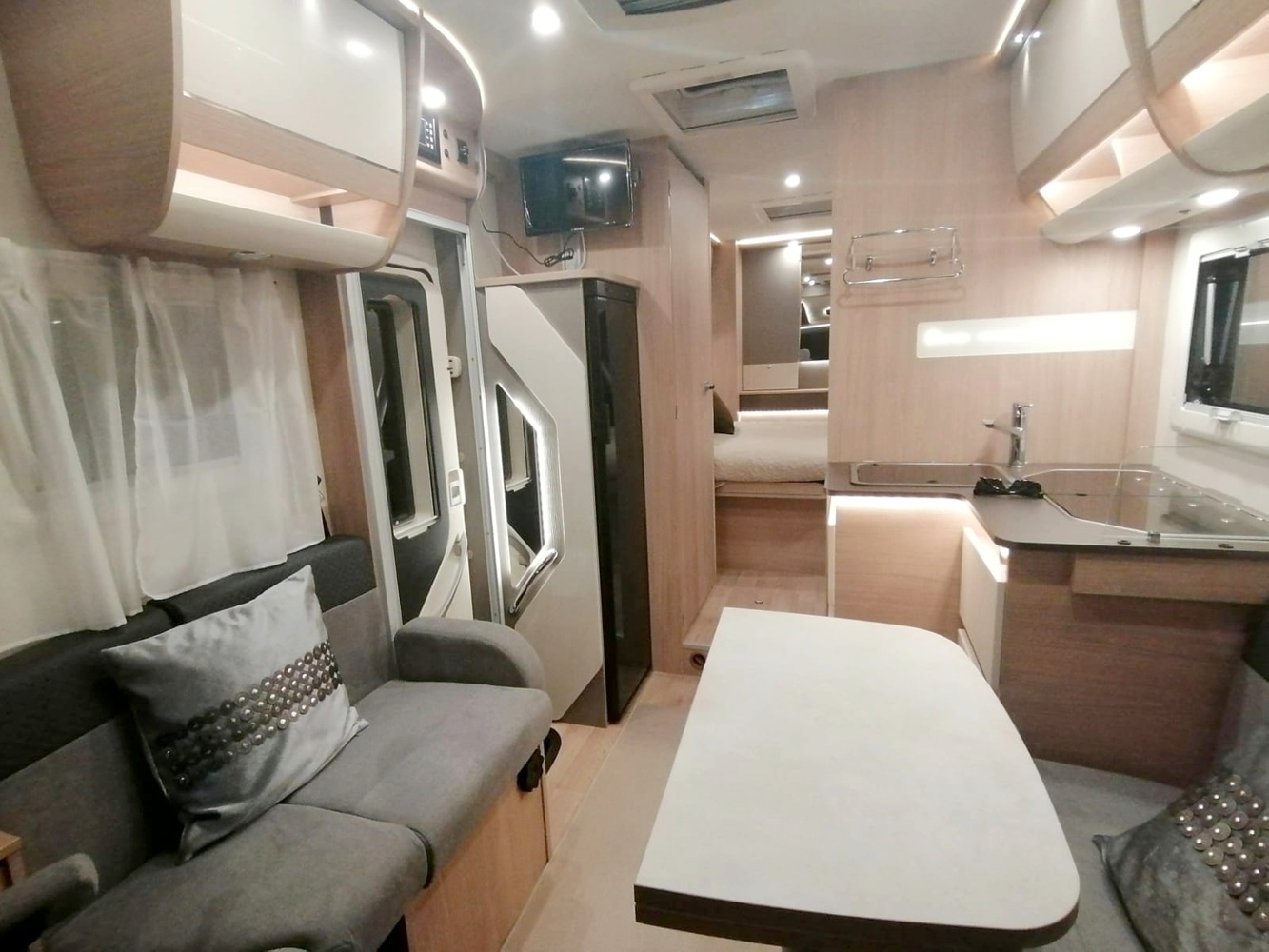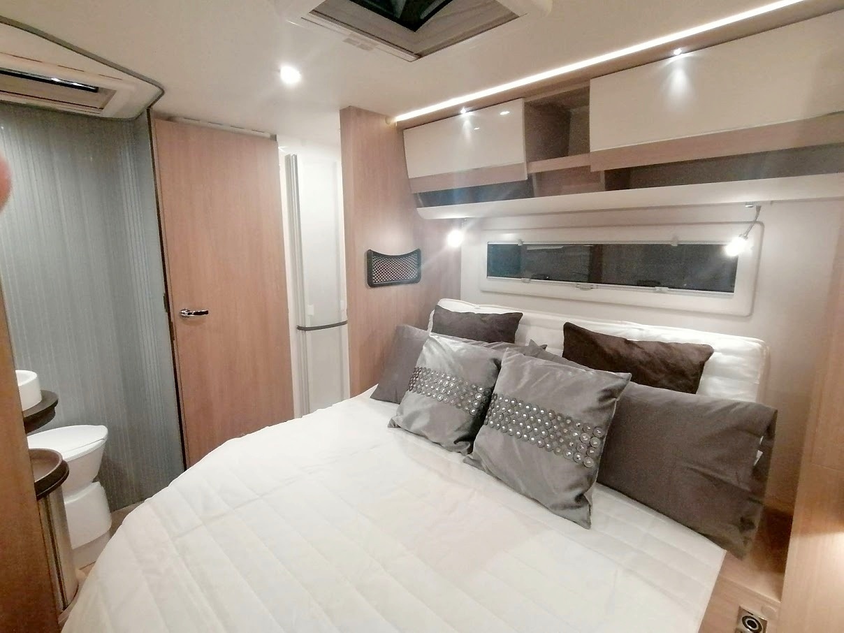 Autocaravana con un gran motor de 160 CV (consumo medio por debajo de 10l/100km), acabados renovados muy especiales y con las dimensiones completas de una integral: cama de matrimonio atrás con Pantalla de Cine y Proyector, esta cama se reclina para hacer más cómoda la posición en caso de ver la tele o leer. Cama abatible de matrimonio encima del puesto de conducción de 1,40 x 200. Salón y dormitorio separados por una puerta que otorga total intimidad.