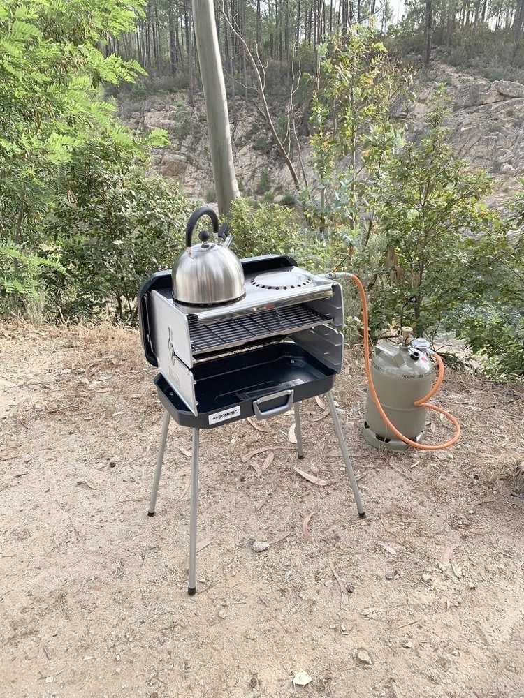 Ansonsten ist der Camper vollständig ausgestattet: Geschirr, Töpfe, Pfanne, Besteck, Campingmöbel, Grill, Anhängerkupplung, Ganzjahresreifen uvm.